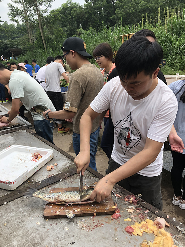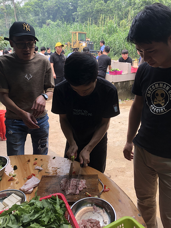 中午時(shí)分,便是野炊。所有團(tuán)隊(duì)人員,爭先搶著擇菜,洗菜,切菜,個(gè)個(gè)上心,心靈手巧,神情專注,像柔指在琴弦上滑動(dòng),在琴鍵上跳動(dòng),那些菜在他們手上簡直就是蝴蝶、蜻蜓、花朵,一劃一撥,簡直是在寫詩。如此曼妙,此景只有人間樂,誰聞天堂有此景。做菜烹調(diào)是難事,也是易事。說難,菜到什么味口,是有級(jí)別的,那是廚師的事,說易,人人搶著炒菜,沒誰說不好,照樣吃得津津有味,興趣盎然,好味,好味……一桌十幾樣菜,花花綠綠,群星燦爛,是勞動(dòng)成果,是智慧結(jié)晶,亦如我們團(tuán)隊(duì)業(yè)務(wù)上的成果,耀眼、驕人……