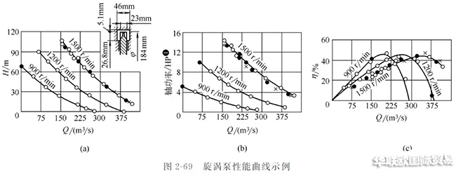 而當(dāng)流量越小,則液體在葉輪內(nèi)的圓周速度和在環(huán)形流道內(nèi)的圓周速度相差越大,離心力相差也越大,縱向旋渦也隨之變大,壓頭也越高。圖2-68和圖2-69為旋渦泵性能曲線及其實例。由兩圖可見,流量減小時,壓頭就增加。