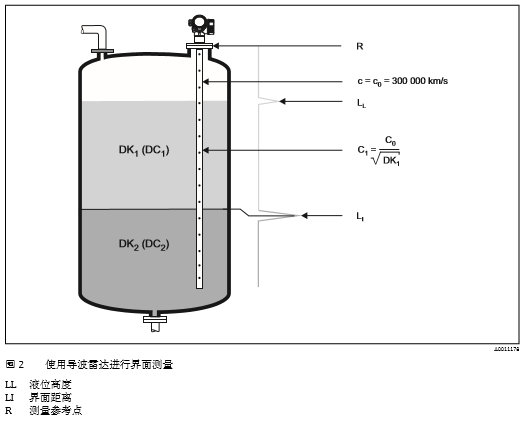 高頻脈沖信號到達(dá)介質(zhì)表面,僅部分脈沖信號發(fā)生反射。上層介質(zhì)的介電常數(shù)DC1較小時,未發(fā) 生反射的脈沖信號將沿探頭繼續(xù)向下傳播。在兩種介質(zhì)的界面處發(fā)生第二次反射(在下層介質(zhì)的介 電常數(shù)DC2大于上層介質(zhì)的介電常數(shù))?;谛谐虝r間原理可以確定儀表至界面間的距離。同時, 還需要考慮脈沖信號在上層介質(zhì)中傳播的延遲時間。介質(zhì)的介電常數(shù)(DC)直接影響高頻脈沖信號的反射率。測量大介電常數(shù)(DC)的介質(zhì)時(例如:水和 氨水),脈沖反射信號強(qiáng);相反,測量小介電常數(shù)(DC)的介質(zhì)時(例如:碳?xì)浠衔?,脈沖反射信 號弱。