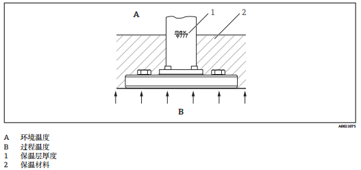 使用高溫型 FMD71 時(shí),設(shè)備的保溫層厚度受限制。儀表上標(biāo)識(shí)有最大允許保溫層厚度和隔熱材料的熱導(dǎo)率(≤ 0.04 W/(m x K))、最高允許環(huán)境溫度和過程溫度。衛(wèi)生型過程連接上無保溫層厚度標(biāo)識(shí)。